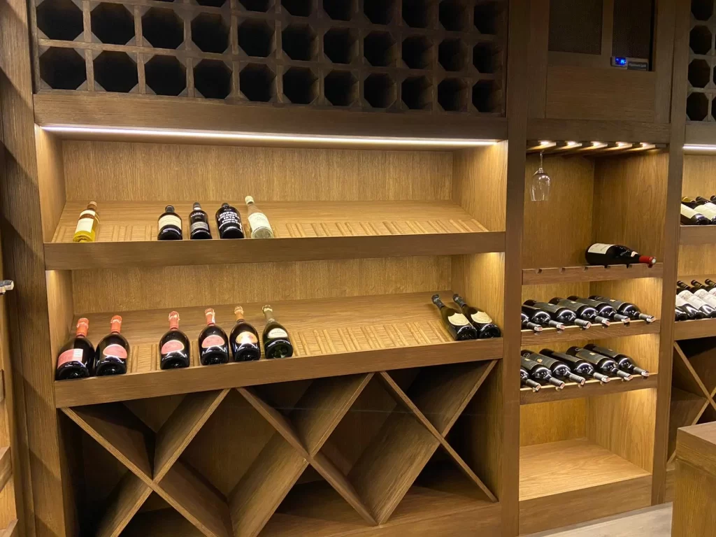 Şarap kavı projemiz, tamamen müşteri istekleri doğrultusunda tasarlandı.Doğal ahşap görünümünün hakim olduğu proje, soft led ışıklandırmalarla estetik bir görsellik kazanırken, farklı şişe depolama üniteleriyle kullanım kolaylığı sağladı.